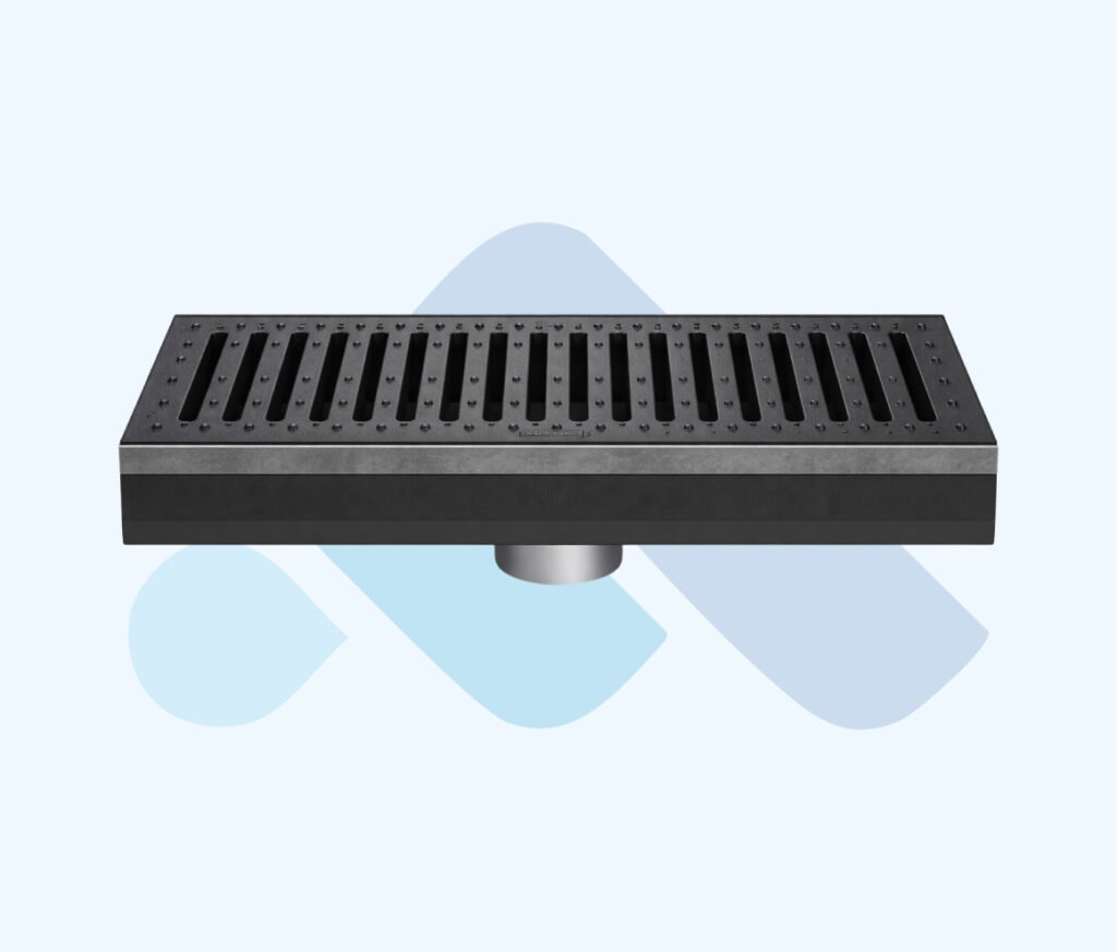 Yüksek debili alanlarda dengeli ve sürekli su tahliyesi için tasarlanmış lineer drenaj sifonudur. Siyah yüzey kaplamalı ızgara, zeminle kontrast veya bütünlük sağlayan uygulamalara uygundur. Otopark, depo, teknik hacim ve endüstriyel zeminlerde güvenle kullanılır.