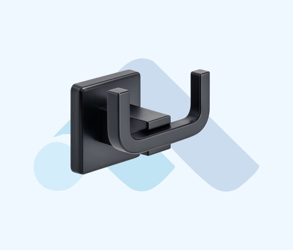 DARK BLACK – 1020 İkili Askılık, siyah kaplama metal gövdesi ve köşeli tasarım dili ile banyo ve ıslak hacimlerde düzenli kullanım sunar. Çift askı kolu sayesinde birden fazla ürünün aynı anda asılmasına imkân tanır.