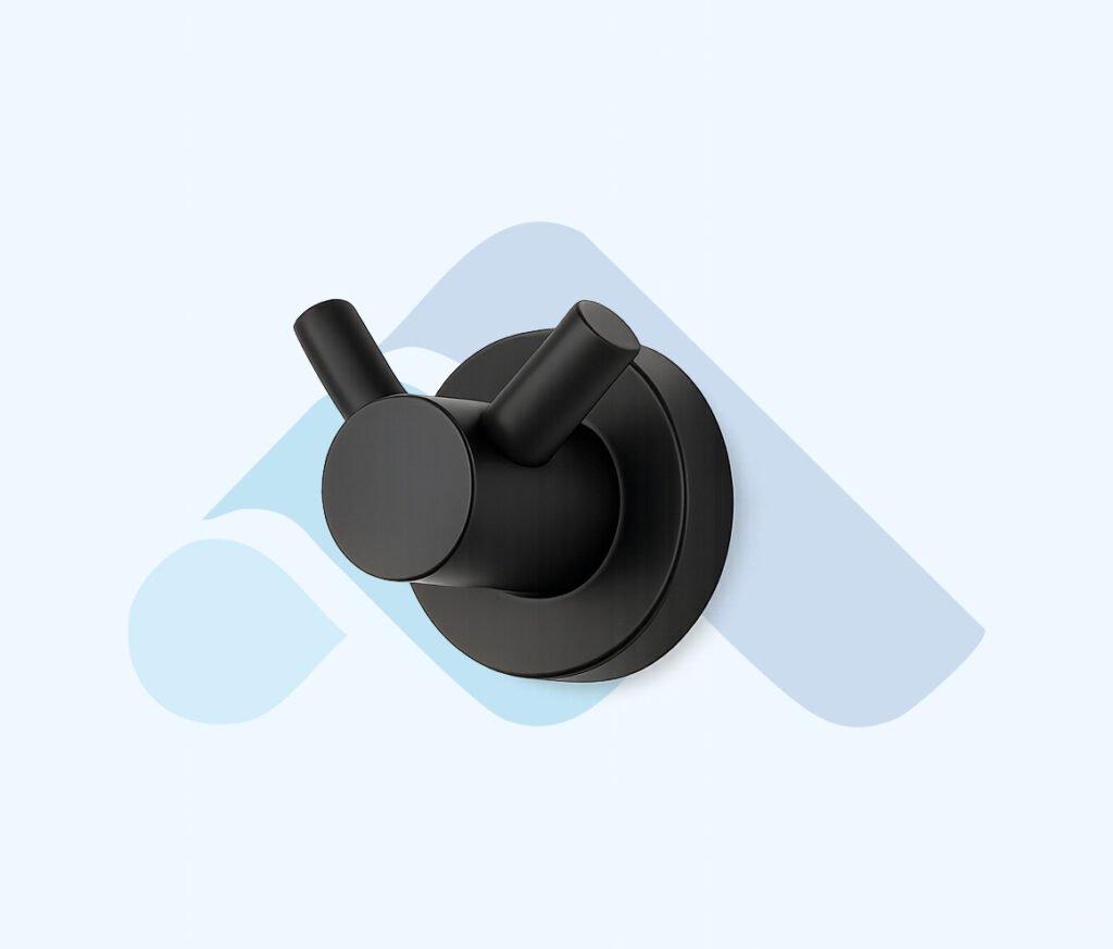 FOCUS BLACK – 1020 İkili Askılık, siyah kaplama ve modern çift kancalı tasarımı ile banyolarda sade ve işlevsel bir çözüm sunar. Havlu, bornoz ve kişisel eşyaların düzenli şekilde asılmasını sağlar.