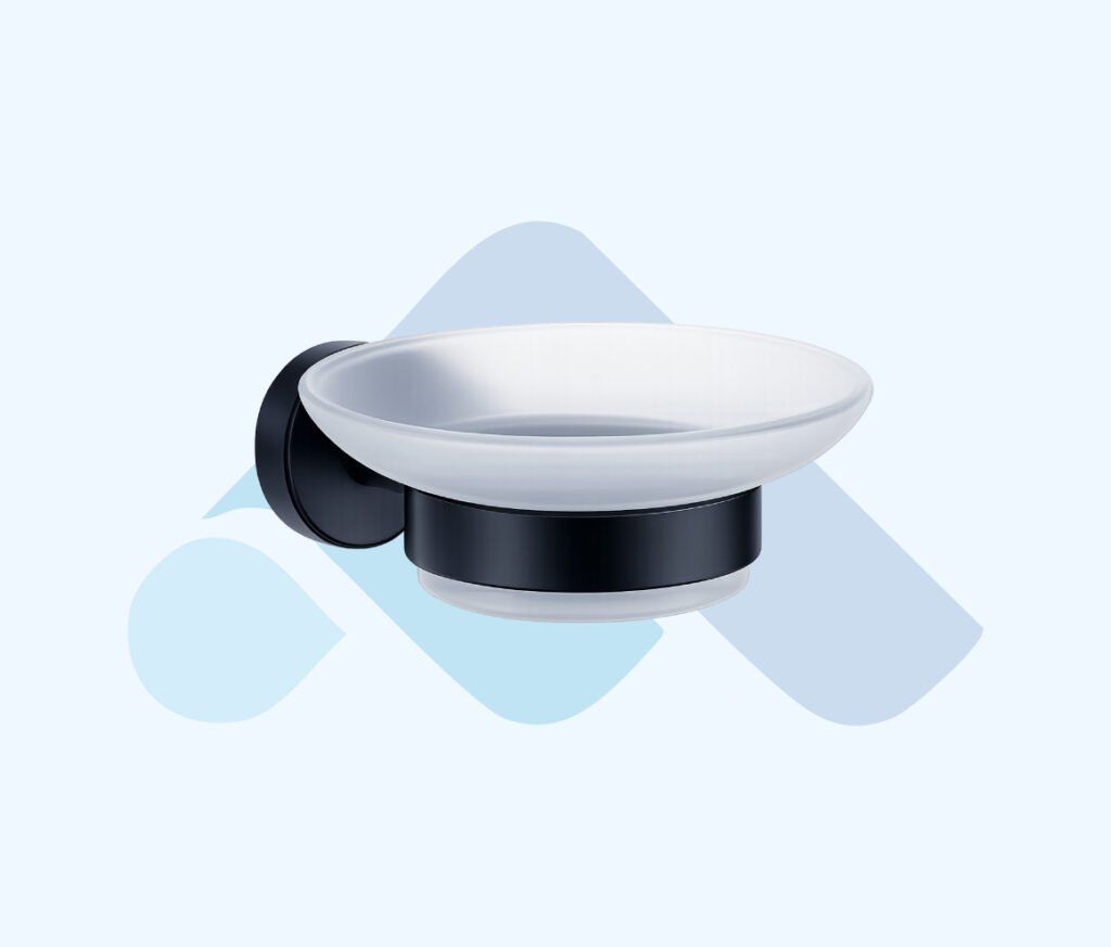 GOLF BLACK – 1004 Sabunluk, siyah kaplama metal gövdesi ve yalın form dili ile lavabo alanında düzenli ve dengeli bir kullanım sunar. Duvara monte edilen yapısı sayesinde tezgâh üzerinde yer kaplamaz.