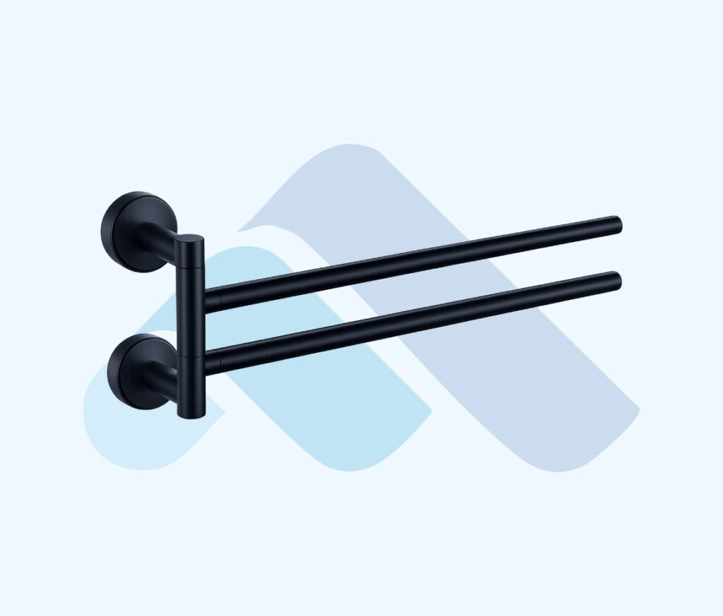 siyah kaplama metal gövdesi ve çift kollu tasarımı ile banyo alanında esnek ve düzenli kullanım sağlar. Döner mekanizması sayesinde kollar bağımsız hareket edebilir.