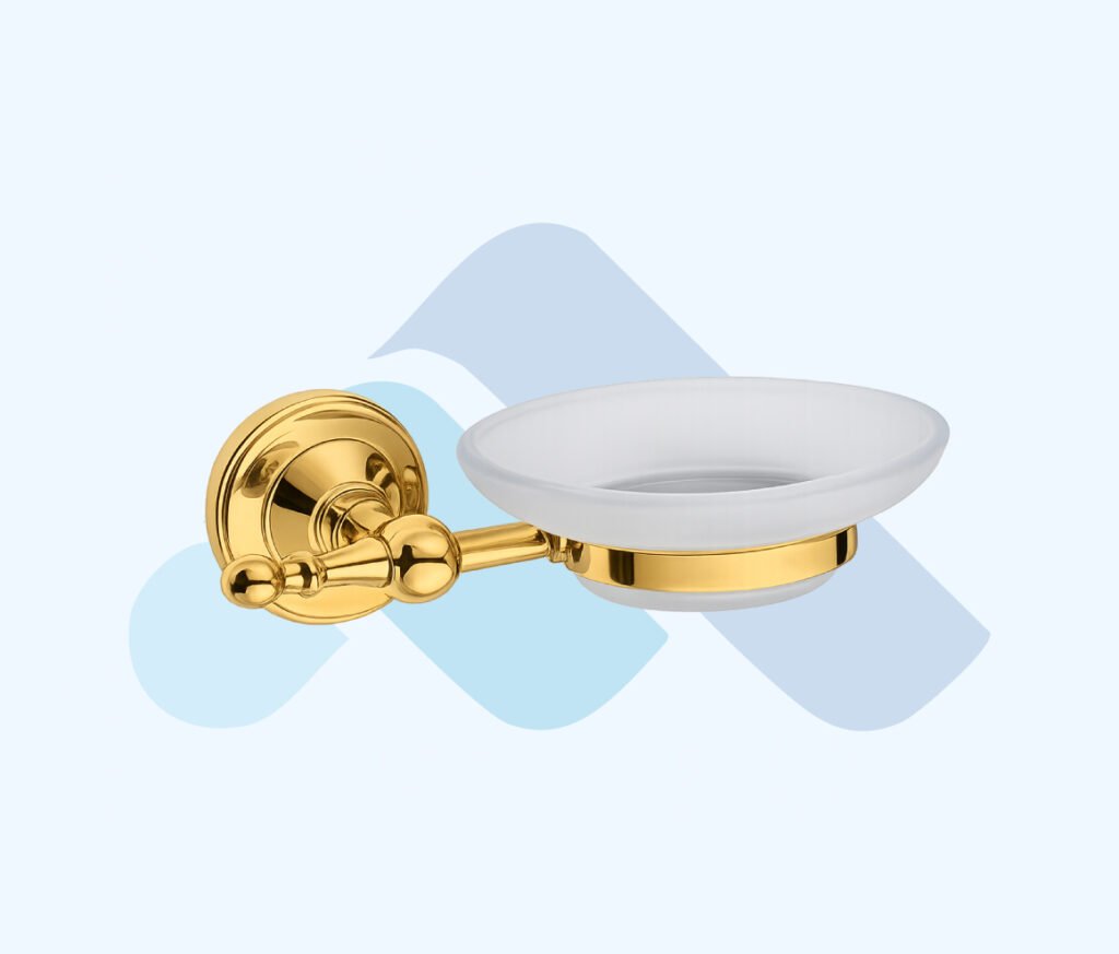 İSTANBUL GOLD – 1004 Sabunluk, özel gold kaplama taşıyıcı gövdesi ve zarif cam haznesi ile lavabo alanında düzenli ve estetik bir kullanım sunar. Sabunun sabit, erişilebilir ve hijyenik şekilde konumlandırılmasını sağlar.