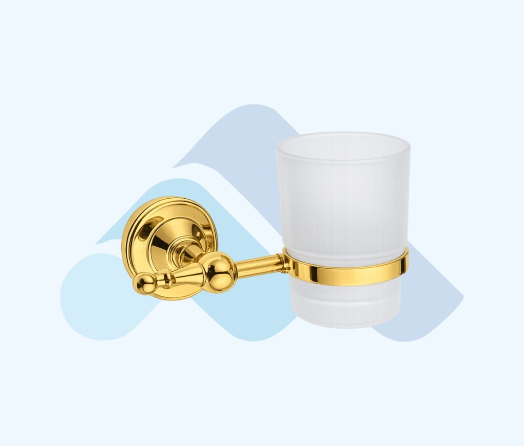 parlak gold kaplama metal gövdesi ve mat cam haznesi ile lavabo alanında düzenli ve hijyenik bir kullanım sunar. Diş fırçası ve benzeri kişisel bakım ürünlerinin sabit ve erişilebilir şekilde konumlandırılmasını sağlar.