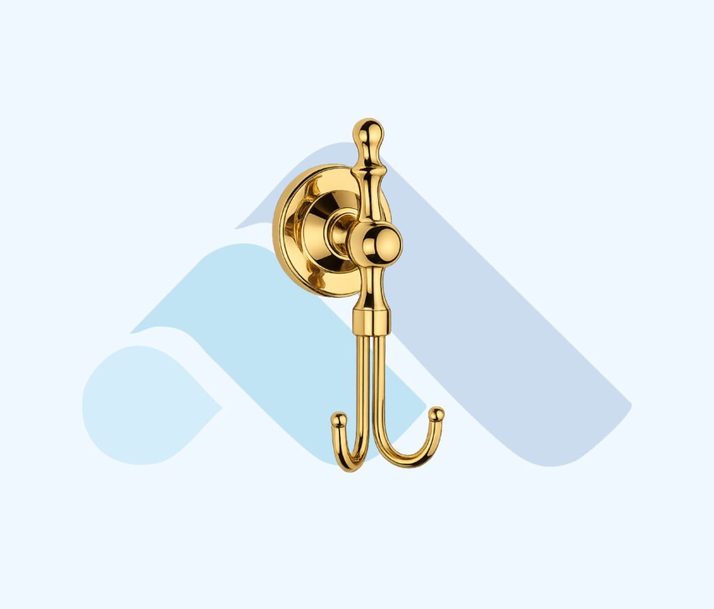 parlak gold kaplama çift kancalı tasarımı ile bornoz, havlu ve kişisel eşyalar için düzenli ve pratik bir kullanım sunar. Duvar üzerinde minimum alan kaplayarak maksimum işlev sağlar.