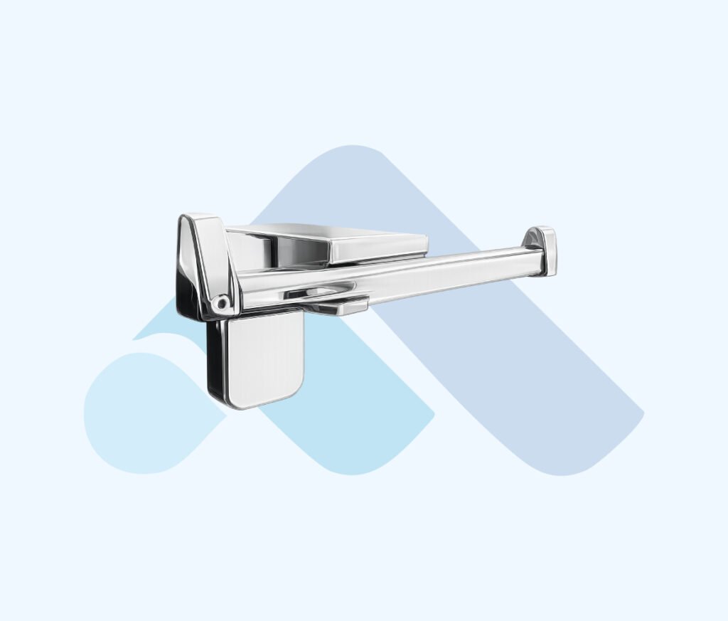 parlak krom kaplama metal gövdesi ve çift askı çıkıntılı tasarımı ile kompakt ve işlevsel bir kullanım sunar. İki ayrı askı noktası, havlu ve bornozların düzenli şekilde asılmasını sağlar.