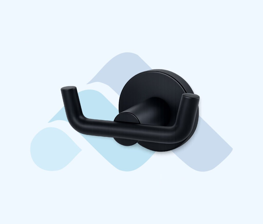 yuvarlak rozetli siyah kaplama metal gövdesi ve çift kollu tasarımı ile kompakt ve işlevsel bir çözüm sunar. İki ayrı askı ucu, havlu ve bornozların düzenli şekilde asılmasını sağlar.